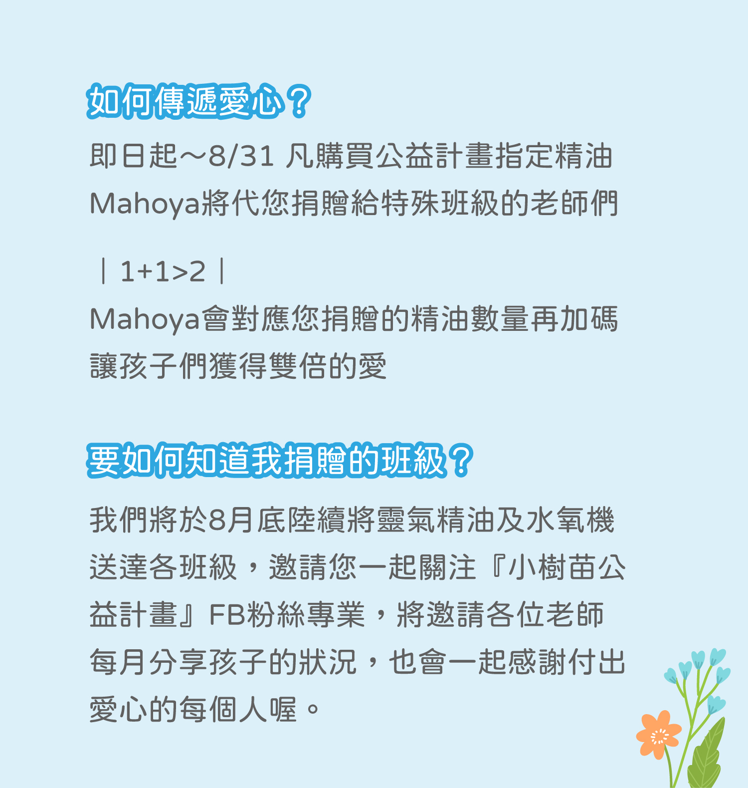 *於本頁購物車下單,即代表您選擇將精油全數捐贈予小樹苗公益計畫。